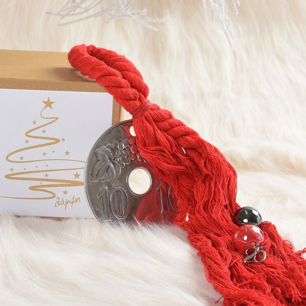 Αγαπημένο γούρι δεκάρα, μεγάλο μέγεθος με στοιχείο φούντα κόκκινη, χάντρες και 2025.