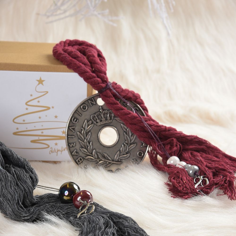 Αγαπημένο γούρι πεντάρα, μεγάλο μέγεθος με φούντα μπορντω, χάντρες και στοιχείο 2025.