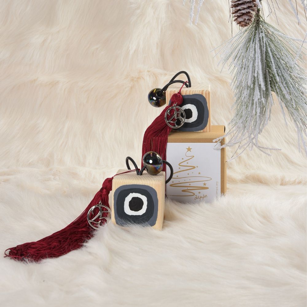 ‘Ενα πρωτότυπο, για κάθε σπίτι, γούρι κύβος με ζωγραφισμένο μάτι. Είναι ξύλινο σε φυσικό χρώμα και έχει στοιχεία 2025, κεραμική χάντρα και φούντα ρεγιου. Χειροποίητο.