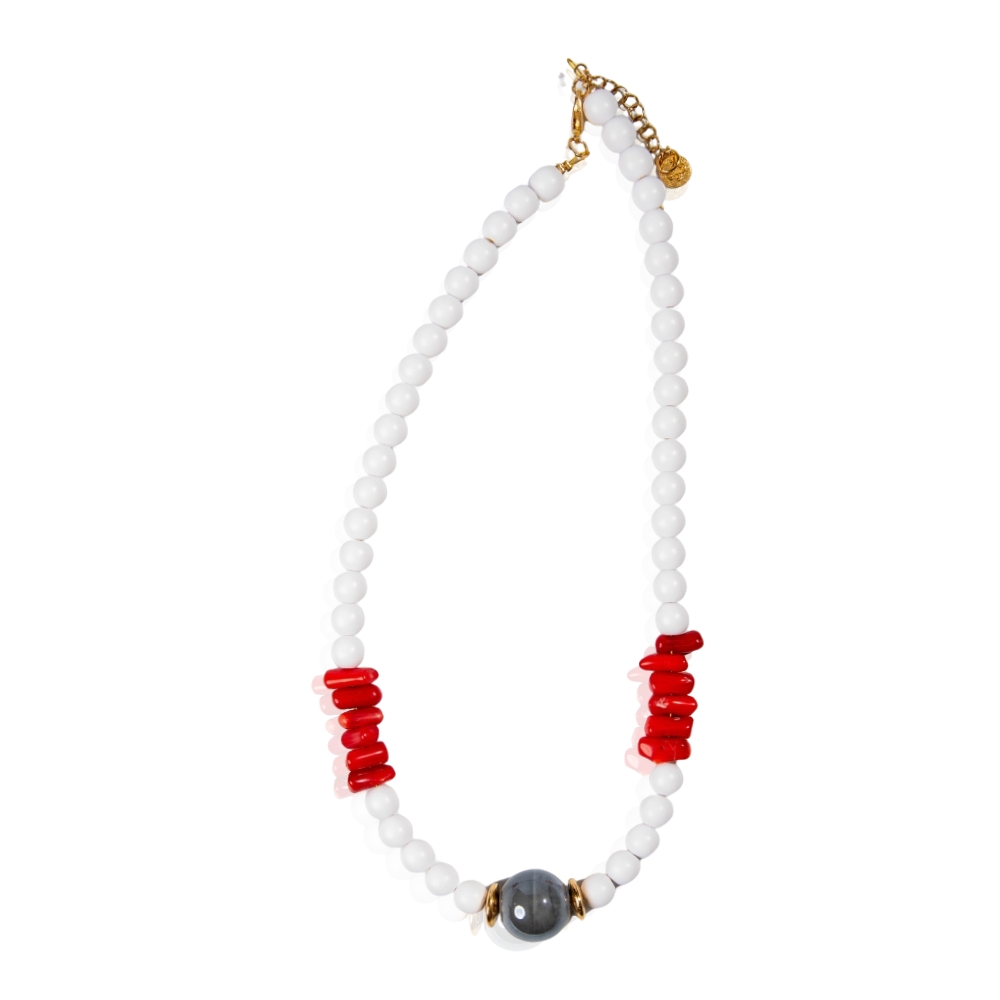 Χειροποίητο κολιέ με λευκές ακρυλικές χάντρες , τσιπς χαολίτη σε κόκκινο και μεγάλη κεραμική χάντρα μαύρη.
