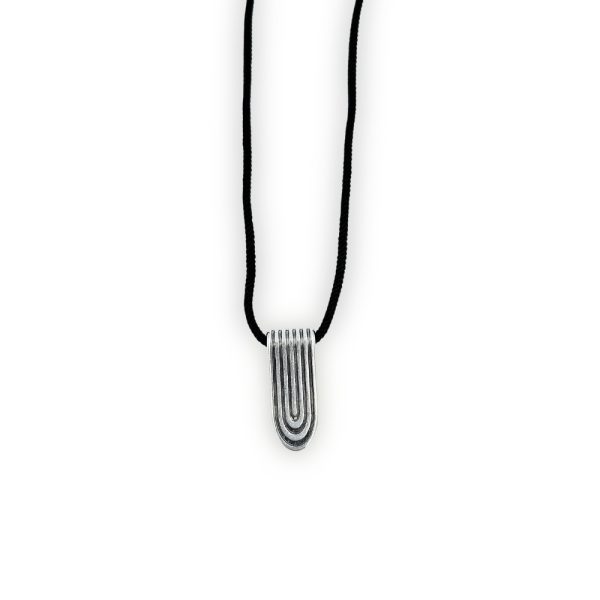 Κρεμαστό κολιέ και στοιχείο ημικύκλιο σε υπέροχο γεωμετρικό σχεδιασμό με λεπτές γραμμές σε ασημί χρώμα. Με μαύρο κορδόνι που στο τελείωμα έχει πλέξη μακραμέ.